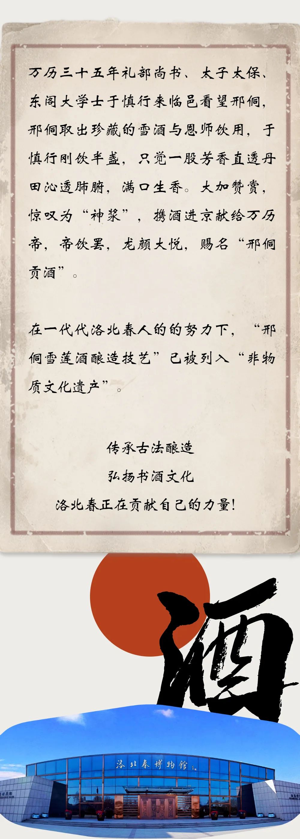 洛北春集團始于建國前的1945年,是魯北白酒的先驅(qū),如今已成功構建起涵蓋白酒、國際紅酒、星級酒店、金融服務及包裝印刷五大板塊的多元化產(chǎn)業(yè)格局。傳承五百年明代古法釀酒技藝,已獲“非物質(zhì)文化遺產(chǎn)”。近八十年來,斬獲國內(nèi)外十大“國字號”榮譽。秉承傳統(tǒng)與創(chuàng)新相結合的發(fā)展理念,成為中華白酒文化的傳承典范。